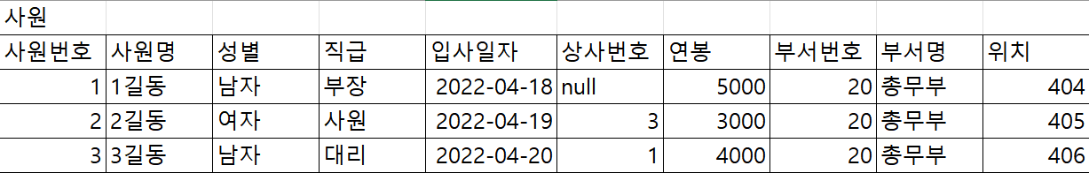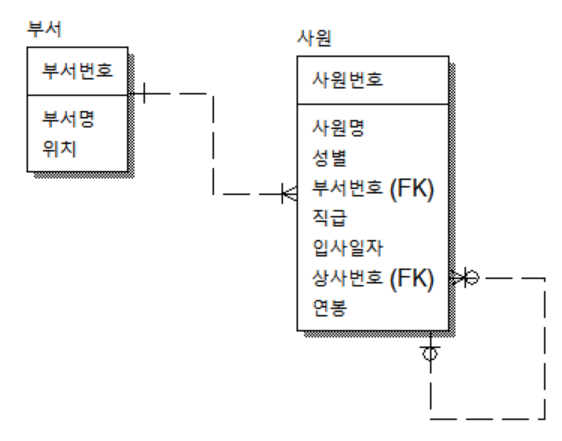 테이블 구조에서 상사번호(외래키)는 사원번호(기본키)를 참조합니다.