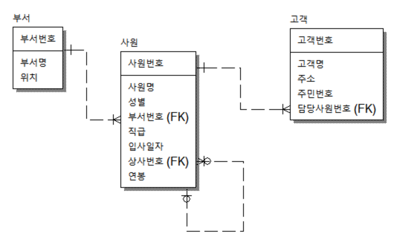 1명의 사원이 여러 명의 고객을 관리하므로 관계는 1:n이 됩니다. 참조무결성 제약 조건은 위에서 설명한 부서-사원